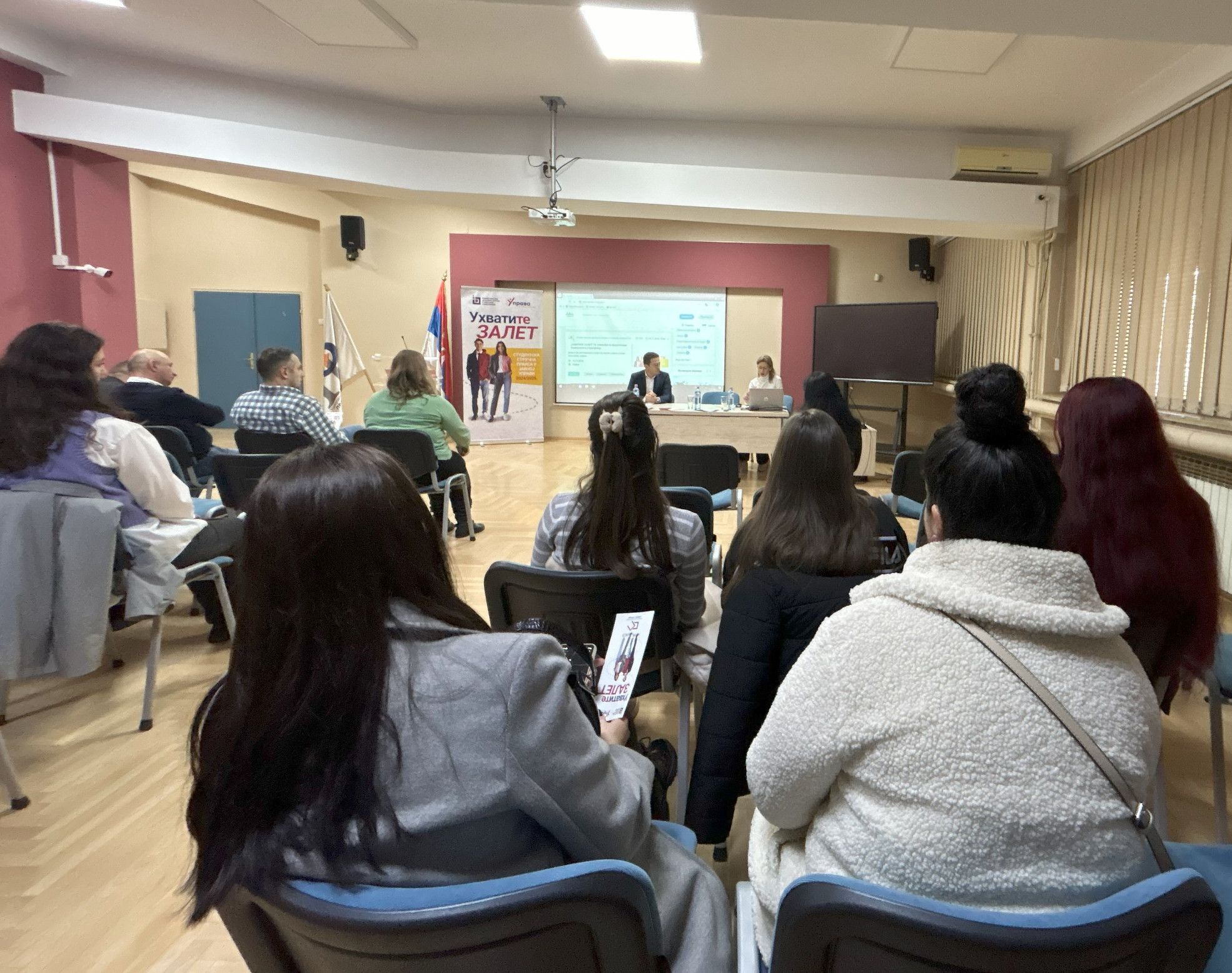 Студенти су чули и искуства својих колега, који су стручну праксу обавили у неком од органа јавне управе у прошлој академској години. Пренели су им своје утиске, предочили бенефите похађања стручне праксе у органима јавне управе и позвали колеге да се пријаве и „Ухвате залет“ за будућу каријеру.