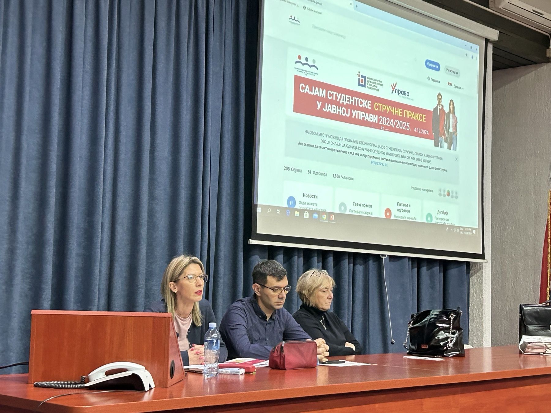 По којим критеријумима се врши избор и селекција на конкурсу, ко врши одабир пријављених студената, затим који су органи јавне управе понудили праксу за њих, као и да ли ће у току саме праксе бити у могућности да испуне обавезе које имају на свом факултету су само нека питања која су студенти поставили. Представници институција дали су свеобухватан преглед стручне праксе, вредне увиде у то шта могу да очекују и добију похађањем стручне праксе. Студенти су информисани и о календару активности студентске стручне праксе.