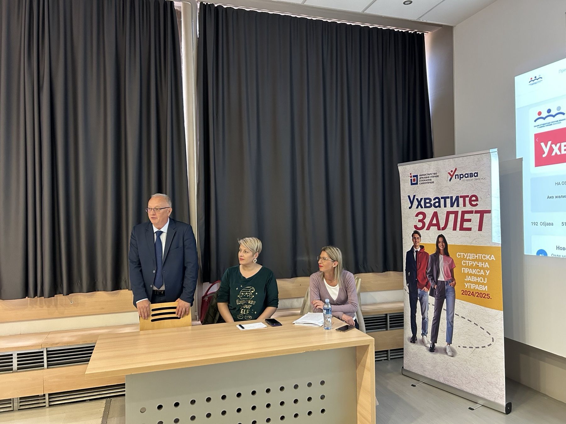 Трибином на Грађевинско-архитектонском факултету Универзитета у Нишу, наставили смо са промоцијом студентске стручне праксе у јавној управи 24/25 године. О приликама које им се нуде кроз стручну праксу у јавној управи у академској 2024/2025. години, са студентима су разговарали представници Министарства државне управе и локалне самоуправе, Градске управе града Ниша, Грађевинско-архитектонског факултета и Универзитета у Нишу.